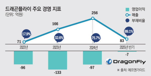 드래곤플라이는 2016년을 마지막으로 2017년부터 9년째 영업손실을 지속하고 있다. 최근 제출된 반기보고서에 따르면 회사의 영업손실은 7억 원으로 전년 대비 크게 줄었다. 하지만 매출액은 83억 원으로 작년의 절반 수준에 그치고 있다.