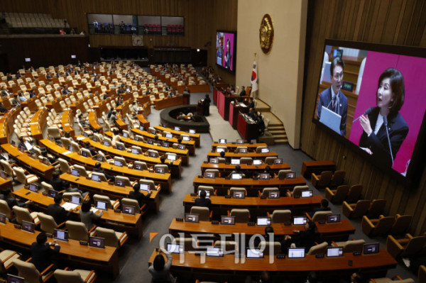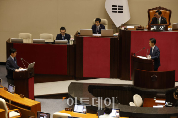 ▲김영훈 고용노동부 장관이 18일 서울 여의도 국회 본회의에서 열린 교육·사회·문화 분야 대정부질문에서 의원 질의에 답변하고 있다. 고이란 기자 photoeran@