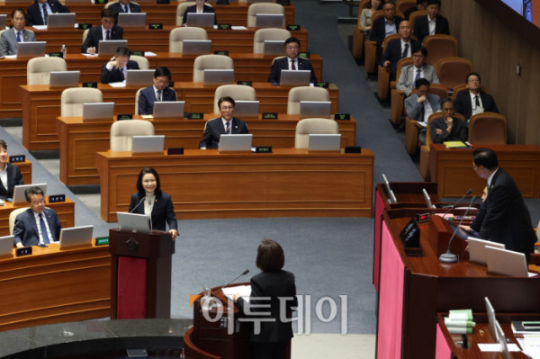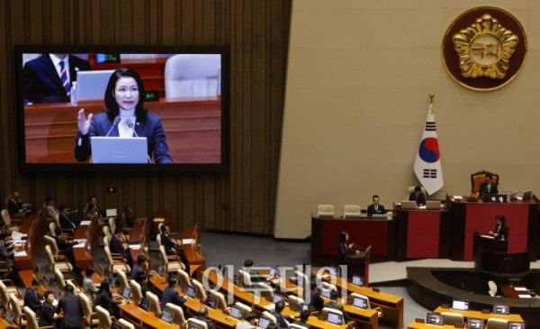 ▲이진숙 방송통신위원장이 18일 서울 여의도 국회 본회의에서 열린 교육·사회·문화 분야 대정부질문에서 의원 질의에 답변하고 있다. 고이란 기자 photoeran@