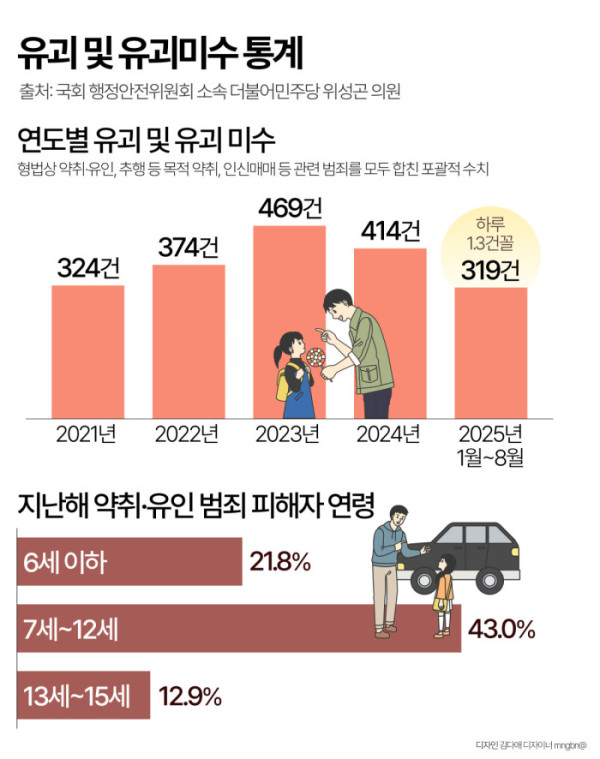 18일 국회 행정안전위원회 소속 더불어민주당 위성곤 의원이 경찰청으로부터 받은 자료에 따르면 올해 1월부터 8월까지 유괴 및 유괴 미수는 319건으로, 이는 하루 1.3건꼴이다.