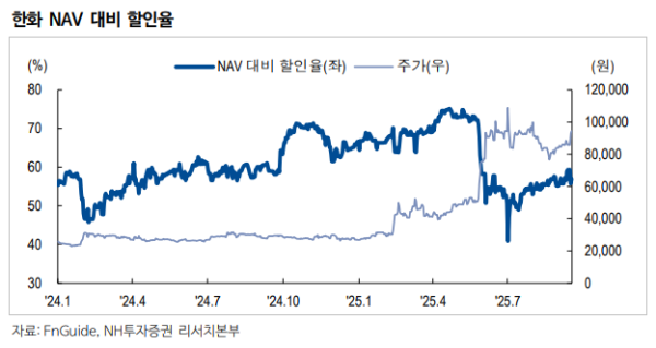 19일 NH투자증권은 한화에 대해 정책 모멘텀에 기반한 순자산가치(NAV) 할인율 축소가 기대된다고 판단했다. 또, 건설과 글로벌 부문 실적 개선을 기대했다. 목표주가 11만9000원, 투자의견 '매수'를 제시하며 커버리지를 개시했. 전 거래일 종가는 9만1900원이다.
