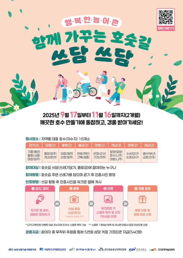 이날 현장에 모인 참여자들은 호숫길 곳곳에서 쓰레기를 정리하며 환경 정화에 힘을 보탰고 농어촌과 지역사회의 지속 가능한 미래를 만들어가겠다는 의지를 다졌다.