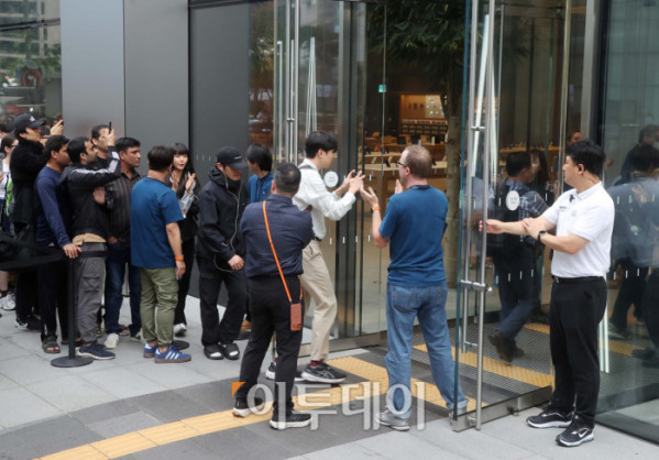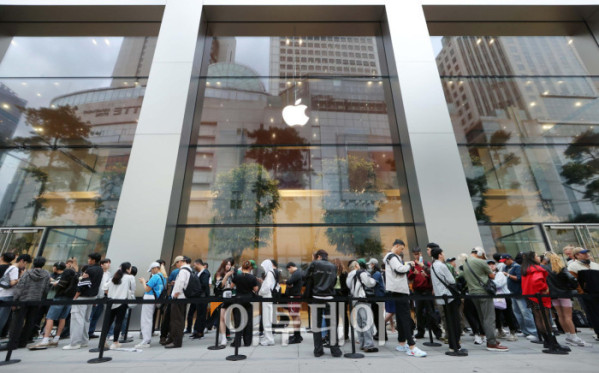 ▲애플의 신제품 정식 판매가 시작되는 19일 서울 중구 명동 애플스토어에서 시민들이 줄을 서고 있다. 이날 애플은 가장 얇은 아이폰 에어를 비롯해 아이폰17, 아이폰17 프로, 아이폰17 프로맥스와 새로운 애플 워치 시리즈인 애플워치11, 애플워치 울트라3, 애플워치 SE3, 에어팟 프로3 등의 신제품을 정식 발매한다. 사진제공=애플코리아
