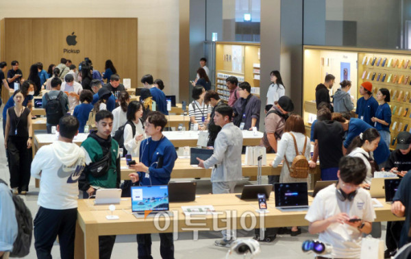 애플의 신제품 정식 판매가 시작되는 19일 서울 중구 명동 애플스토어에서 시민들이 제품을 체험하고 있다. 이날 애플은 가장 얇은 아이폰 에어를 비롯해 아이폰17, 아이폰17 프로, 아이폰17 프로맥스와 새로운 애플 워치 시리즈인 애플워치11, 애플워치 울트라3, 애플워치 SE3, 에어팟 프로3 등의 신제품을 정식 발매한다. 사진제공=애플코리아