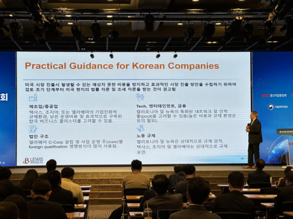 스콧 리 LBBS 로펌 파트너 변호사는 "한국기업의 성공적인 미국 시장 진출을 위해선 각각의 주별로 상이한 법 제도에 대한 분석이 선행돼야 한다"며 "미국 시장은 한국 기업의 확장 기회임과 동시에 주별로 상이한 법 제도로 인한 법 제도를 수반하는 시장"이라고 말했다.