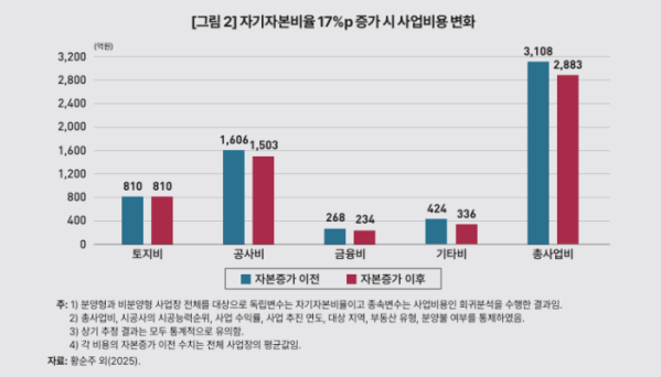 황 위원이 시행사가 자기자본을 늘렸을 때 어떤 영향이 있는지 분석한 결과 자기자본비율이 높을수록 PF 사업 착수 이후 공급비용인 총사업비가 줄고 사업 과정에서 분양·부실 리스크 등 각종 위험요인도 감소하는 것으로 나타났다.