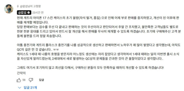 논란이 확산되자 잇섭은 22일 유튜브 채널 'UPSub없섭' 고정 댓글을 통해 “현재 게트리 아이폰17 스킨 케이스의 초기 불량으로 인해 부득이하게 판매를 중지했다”며 “검수를 우선 다 끝내고 개선된 제품을 다시 판매하겠다”고 밝혔다. 그는 “아톰 충전기와 게트리 플라스크 충전기를 성공적으로 생산하며 노하우가 쌓였다고 생각했는데 아직 QC의 길은 멀다”며 “2세대에서 새로 발생한 QC상의 문제를 간과한 것이 불찰이었다”고 자성했다.