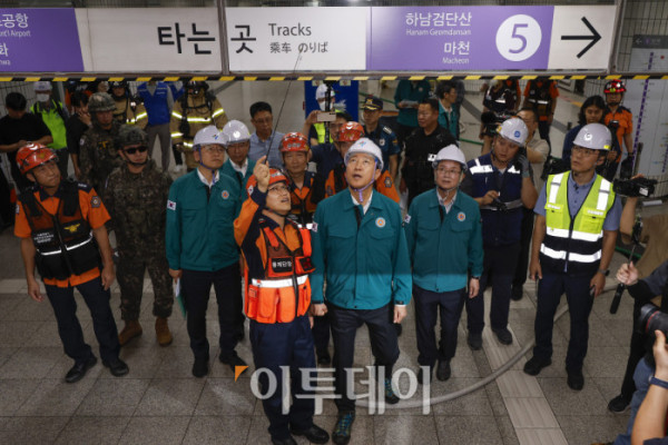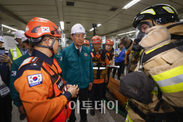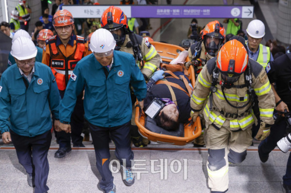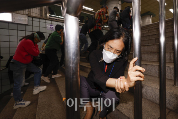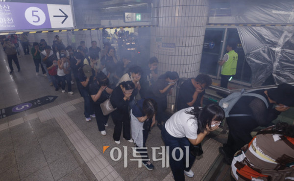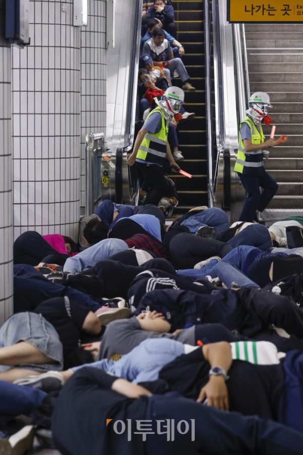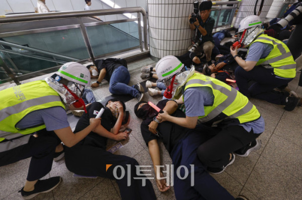 ▲22일 서울 영등포구 여의나루역 일대에서 열린 2025년 서울시 재난대응 안전한국훈련에서 서울교통공사 직원들이 대피 훈련을 하고 있다. 재난대응 안전한국훈련은 지하 47m(아파트 16층 높이)에 위치해 지상으로 이동 동선이 긴 5호선 여의나루역에서 휴대용 배터리 발화 및 고의적 방화로 화재가 발생, 대피 중 인파 사고와 흉기 난동 등이 복합적으로 발생하는 상황을 가정해 이뤄졌다. 조현호 기자 hyunho@