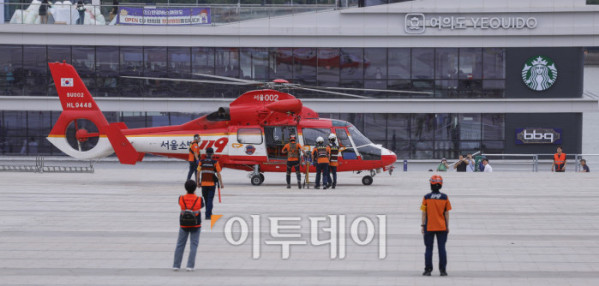 ▲22일 서울 영등포구 여의나루역 일대에서 열린 2025년 서울시 재난대응 안전한국훈련에서 소방헬기가 부상자를 이송하고 있다. 재난대응 안전한국훈련은 지하 47m(아파트 16층 높이)에 위치해 지상으로 이동 동선이 긴 5호선 여의나루역에서 휴대용 배터리 발화 및 고의적 방화로 화재가 발생, 대피 중 인파 사고와 흉기 난동 등이 복합적으로 발생하는 상황을 가정해 이뤄졌다. 조현호 기자 hyunho@