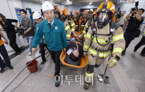 ▲오세훈 서울시장이 22일 서울 영등포구 여의나루역 일대에서 열린 2025년 서울시 재난대응 안전한국훈련에서 소방대원들과 함께 인명 구조 훈련을 하고 있다. 재난대응 안전한국훈련은 지하 47m(아파트 16층 높이)에 위치해 지상으로 이동 동선이 긴 5호선 여의나루역에서 휴대용 배터리 발화 및 고의적 방화로 화재가 발생, 대피 중 인파 사고와 흉기 난동 등이 복합적으로 발생하는 상황을 가정해 이뤄졌다. 조현호 기자 hyunho@