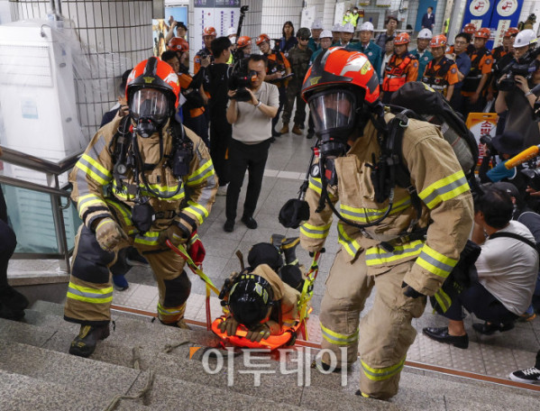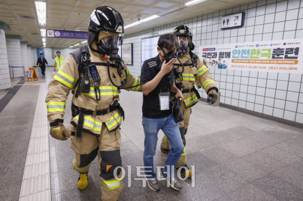▲22일 서울 영등포구 여의나루역 일대에서 열린 2025년 서울시 재난대응 안전한국훈련에서 소방대원들이 대피 훈련을 하고 있다. 재난대응 안전한국훈련은 지하 47m(아파트 16층 높이)에 위치해 지상으로 이동 동선이 긴 5호선 여의나루역에서 휴대용 배터리 발화 및 고의적 방화로 화재가 발생, 대피 중 인파 사고와 흉기 난동 등이 복합적으로 발생하는 상황을 가정해 이뤄졌다. 조현호 기자 hyunho@