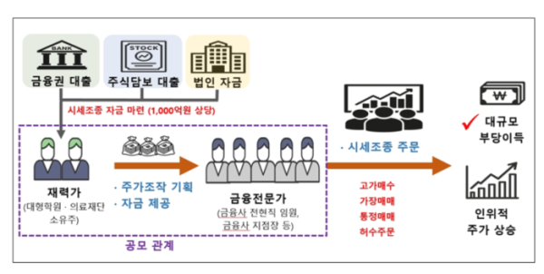 23일 금융위원회와 금융감독원, 한국거래소가 참여하는 ‘주가조작 근절 합동대응단’은 “2024년 초부터 현재까지 특정 종목을 은밀하게 조작해 400억 원의 부당이득을 챙긴 대규모 세력을 적발했다”고 밝혔다. 이들은 종합병원, 한의원, 대형학원 등을 운영하는 사회적 명망가로 금융회사 지점장·자산운용사 임원·유명 사모펀드 전직 임원 등 금융 전문가들과 공모했다. 합동대응단 조사 결과 실제로 취득한 시세차익만 230억 원에 달한다. 아직 보유 중인 주식 규모는 1000억 원 수준으로 파악됐다.