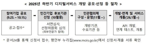 이번 공모는 다음 달 15일까지 공고·접수를 거쳐 다음 달 중 민간기업 후보기관 선정, 11월 민·관 협의체 구성·운영, 내년 1월 이후 개발·연계 및 서비스 개통 순으로 진행된다. 후보기관 선정은 서면심사, 선정위원회 심의를 통해 이뤄진다. 선정위원회에는 외부 전문가가 참여한다. 민·관 협의체에는 개방기관과 수요기관 등이 참여한다. 신청서는 문서24를 통해 제출할 수 있다. 신청서 양식과 제출서류는 행안부 누리집에서 확인할 수 있다.