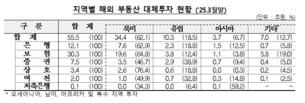 2일 금융감독원에 따르면 올해 3월 말 기준 금융사의 해외 부동산 대체투자 잔액은 55조5000억 원으로 집계됐다. 이는 전 분기 대비 5000억 원 줄어든 수치다.