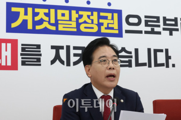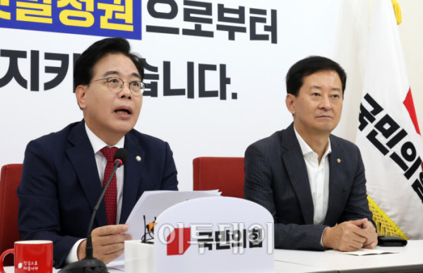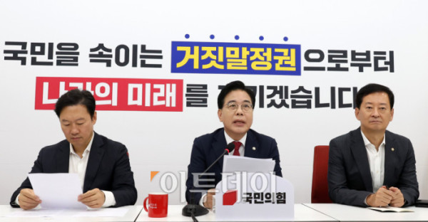 ▲송언석 국민의힘 원내대표가 23일 서울 여의도 국회에서 취임 100일 기자회견을 하고 있다. 고이란 기자 photoeran@