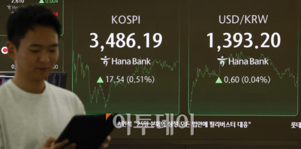 코스피가 사상 최고치를 새로 쓴 23일 서울 중구 하나은행 딜링룸 전광판에 코스피, 코스닥, 원·달러 환율이 표시돼 있다. 이날 코스피 지수는 전 거래일보다 17.54(0.51%)포인트 상승한 3486.19를 코스닥 지수는 2.15(0.25%)포인트 하락한 872.21을 나타냈다. 코스피는 장중 3494.49까지 오르며 사상 최고가를 경신했다. 원·달러 환율은 종가 기준 1392.90원을 나타냈다. 조현호 기자 hyunho@
