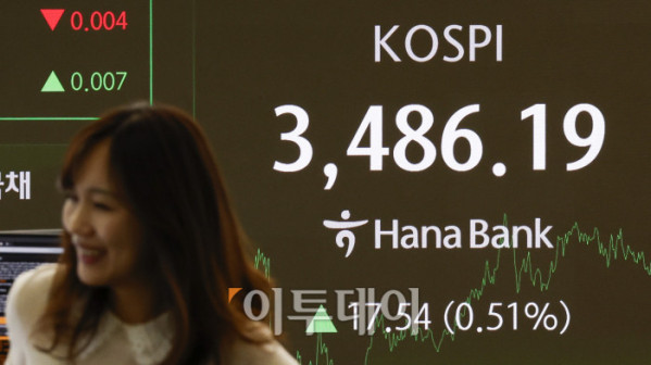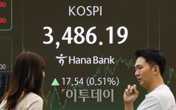 ▲코스피가 사상 최고치를 새로 쓴 23일 서울 중구 하나은행 딜링룸 전광판에 코스피가 표시돼 있다. 이날 코스피 지수는 전 거래일보다 17.54(0.51%)포인트 상승한 3486.19를 나타냈다. 코스피는 장중 3494.49까지 오르며 사상 최고가를 경신했다. 조현호 기자 hyunho@