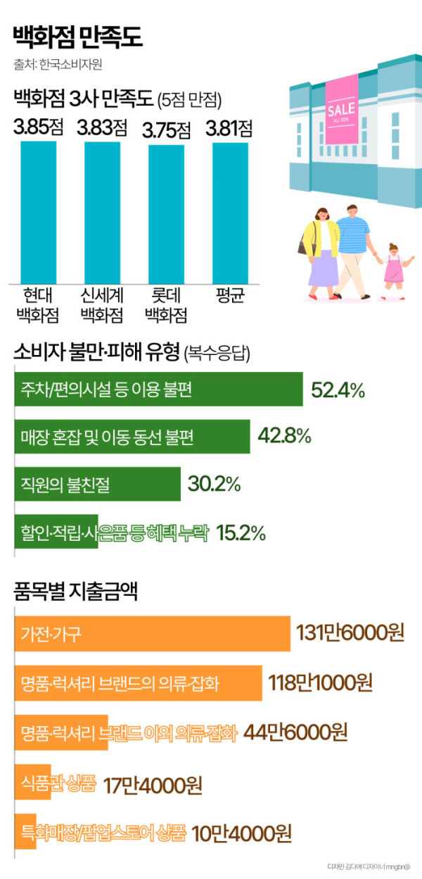 백화점을 이용하면서 불만이나 피해를 경험한 소비자의 52.4%는 '주차·편의시설 등 이용 불편'에 대한 불만이 가장 많았다. 이어 '매장 혼잡 및 이동 동선 불편'(42.8%), '직원의 불친절'(30.2%), '할인 등 혜택 누락'(15.2%) 등이었다.