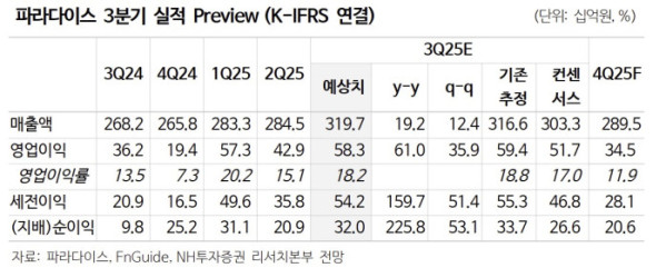 파라다이스의 3분기 연결기준 매출액은 전년 동기 대비 19% 증가한 3197억 원, 영업이익은 61% 늘어난 583억 원으로 시장 컨센서스 상회할 것으로 봤다. 인바운드 확대에 따른 매스 고객 성장세가 매출액 성장세를 견인한 가운데, 영업비용 효율화 및 호텔 성수기 효과 두드러진 것으로 분석됐다.