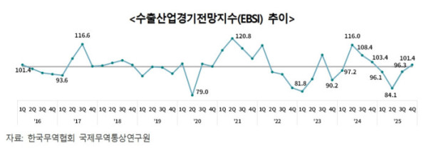 무협 국제무역통상연구원은 25일 발표한 ‘4분기 수출산업경기전망(EBSI)’ 보고서에서 4분기 EBSI가 103.7을 기록했다고 밝혔다. 이는 전 분기(97.3)보다 6.4포인트 상승한 수치로 기준치(100)를 웃돌아 수출 경기가 개선 국면에 진입했음을 의미한다.