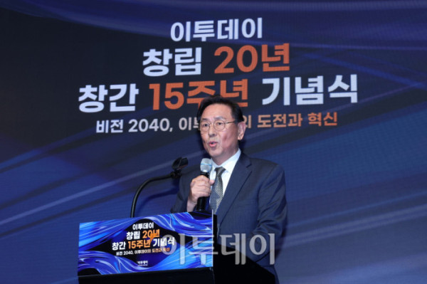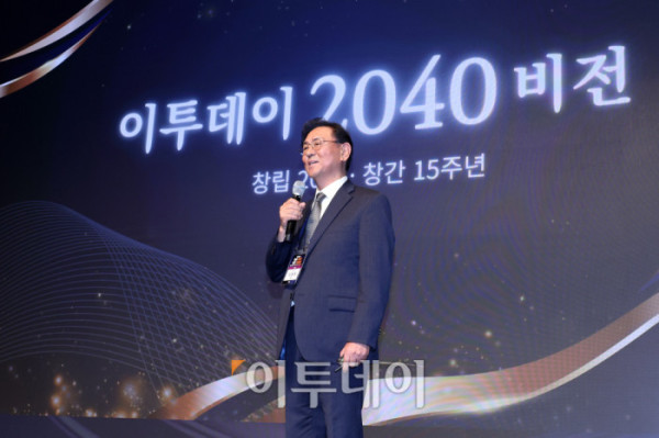 이종재 이투데이 대표가 24일 서울 서초구 JW메리어트 호텔 서울 그랜드볼룸에서 열린 이투데이 창립 20년, 창간 15주년 기념식 '비전 2040, 이투데이의 도전과 혁신'에서 비전발표를 하고 있다. 이번 기념식은 이투데이의 여정을 돌아보며, 새로운 도약을 선언하는 자리이다. 고이란 기자 photoeran@