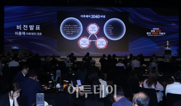 ▲이종재 이투데이 대표가 24일 서울 서초구 JW메리어트 호텔 서울 그랜드볼룸에서 열린 이투데이 창립 20년, 창간 15주년 기념식 '비전 2040, 이투데이의 도전과 혁신'에서 비전발표를 하고 있다. 이번 기념식은 이투데이의 여정을 돌아보며, 새로운 도약을 선언하는 자리이다. 고이란 기자 photoeran@