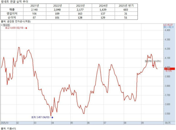 올해 상반기 실적은 더욱 악화했다. 반기 매출액은 603억 원, 영업이익은 31억 원으로 전년 동기 대비 각각 17.0%, 48.6%씩 감소했다. 이러한 실적 부진은 주가에도 영향을 미쳤다. 링네트는 호실적에 대한 기대로 2024년 4월 7000원 언저리까지 주가가 올랐지만, 현재 4000원 수준까지 주저앉은 상태다.