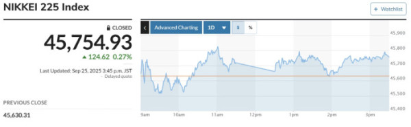 이날 마켓워치에 따르면 일본증시 닛케이225(닛케이)는 전날보다 124.62포인트(0.27%) 오른 4만5754.93엔으로 마감했다. 기술주 중심의 토픽스는 급등 출발 후 등락을 반복했다. 종가는 14.90포인트(0.47%) 오른 3185.35였다.