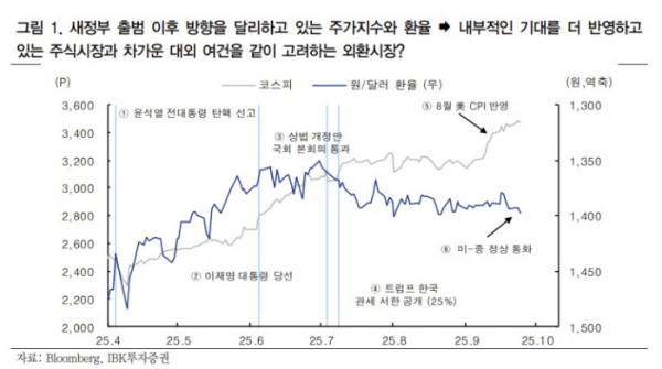26일 IBK투자증권은 "지금의 엇갈림은 단순한 괴리가 아니다. 주식시장은 대내적 기대감에 들떠 있는 반면, 원화는 차갑고 불안정한 대외 현실을 드러낸다"며 이같이 밝혔다.