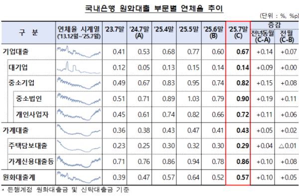 26일 금융감독원이 발표한 '2025년 7월 말 국내은행의 원화 대출 연체율 현황'에 따르면 신규연체 발생액은 전월과 유사한 2조8000억 원, 연체채권 정리 규모는 전월 대비 4조1000억 원 감소한 1조6000억 원을 각각 나타냈다.