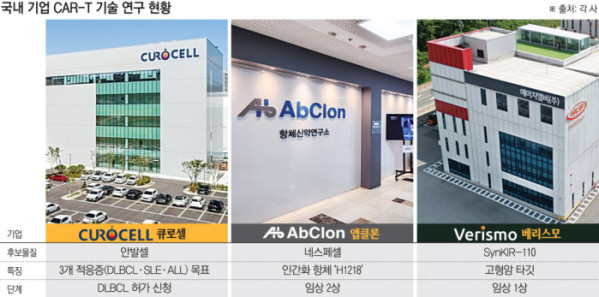 30일 제약바이오 업계에 따르면 현재 국내에서는 큐로셀과 앱클론이 각각 CAR-T 치료제 연구 막바지 단계에 있다. 큐로셀은 식약처에 후보물질 ‘안발셀’에 대한 허가 신청을 완료했으며, 앱클론은 ‘네스페셀’의 2상 중간분석 결과 완전관해율 68%를 달성했다.