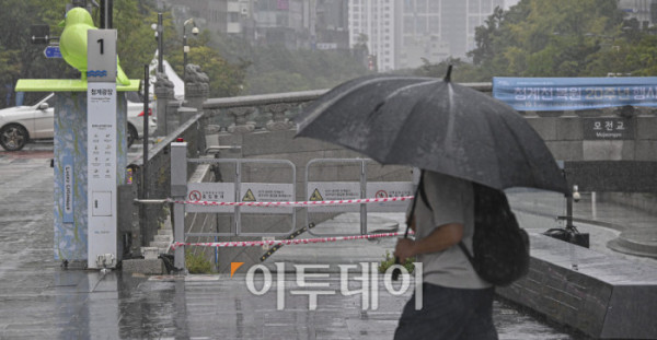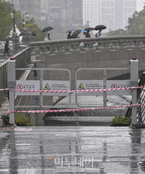 ▲전국 대부분 지역에 비가 내린 28일 서울 중구 청계천 출입이 통제되고 있다. 기상청은 오전부터 낮 사이 수도권과 충남 북부를 중심으로 시간당 20mm 안팎의 강한 비가 집중되겠다고 예보했다. 비는 늦은 오후 대부분 그치겠지만, 전남 남부와 경남 서부는 늦은 오후까지 이어질 것으로 전망된다. 예상 강수량은 서울·인천·경기·충남 북부·제주도 10∼60㎜, 강원 내륙과 산지·대전·세종·충남 남부·충북·전북·광주·전남 10∼40㎜ 등이다. 조현호 기자 hyunho@