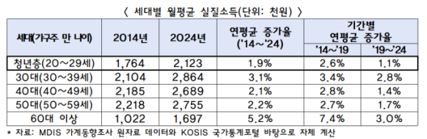 최근 10년간 청년층 실질소득 증가율은 연 1.9%로 전 세대 중 가장 낮았으며, 실질소득 증가 추세도 과거 5년 연평균 증가율 2.6%에서 최근 5년 연평균 1.1%로 둔화했다.