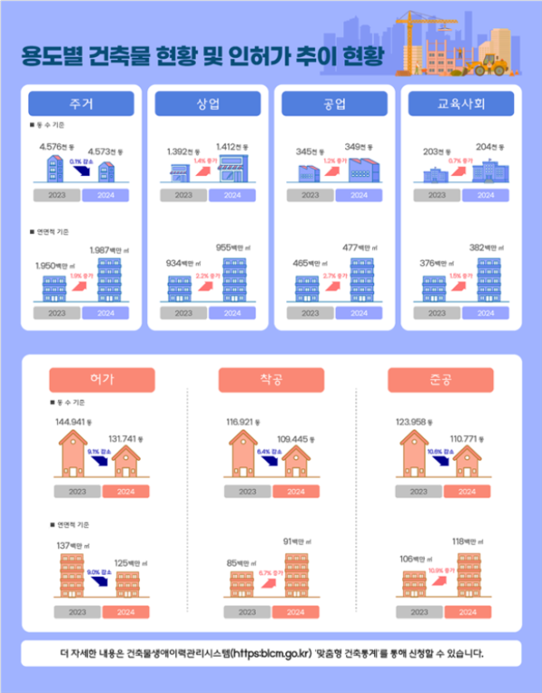 용도별 면적을 살펴보면 주거용 건축물은 전체 연면적의 46.1%(19억8715만㎡)를 차지했다. 세부 유형별로는 아파트가 12억8786만㎡로 주거용 건축물의 64.8%를 차지해 가장 많았다. 특히 아파트는 동수(16만4000동, 2.2% 증가)와 연면적(2.8% 증가)이 동시에 늘어난 유일한 주택 유형이었다. 반면 단독·다가구주택은 동수가 줄었고 연립·다세대주택은 동수는 제자리거나 소폭 줄었으며 연면적만 소폭 증가했다.