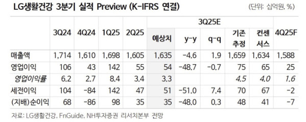 화장품 매출액은 12% 줄어든 5731억 원, 영업손실은 300억 원으로 적자전환할 것으로 추정됐다. 정 연구원은 "방판, 백화점 등 전통 채널 재정비로 하반기 매출 감소에 따른 고정비 부담 지속됐다"고 분석했다.