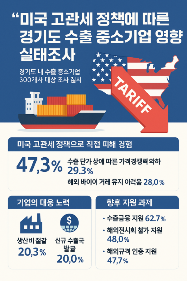 김현곤 경과원장은 “이번 조사로 미국 고관세 정책 변화가 도내 수출 중소기업에 상당한 충격을 주고 있음을 확인했다”며 “기업들의 자구노력만으로는 한계가 있는 만큼 금융·마케팅 등 현장에서 체감할 수 있는 지원을 강화해 나가겠다”고 말했다.