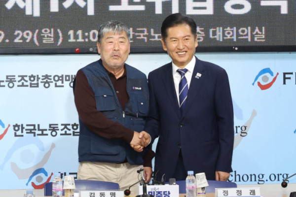 ▲정청래(오른쪽) 더불어민주당 대표와 김동명 한국노총 위원장이 29일 서울 영등포구 한국노총 대회의실에서 열린 2025년도 제1차 한국노총-민주당 고위급정책협의회에서 악수하고 있다. (고이란 기자 photoeran@)