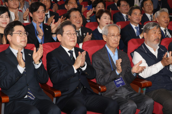 ▲4월 서울 여의도 국회 의원회관에서 열린 더불어민주당 '이제부터 진짜 대한민국' 제21대 대통령선거 선거대책위원회 출범식에서 당시 이재명 대선 후보가 참석자들과 박수치고 있다. 앞줄 왼쪽부터 박찬대 상임총괄선대위원장, 이 후보, 윤여준 상임총괄선대위원장, 김동명 총괄선대위원장. (고이란 기자 photoeran@)