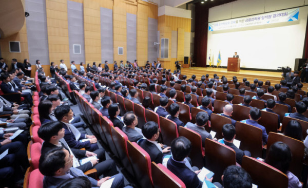 ▲이찬진 금융감독원장이 29일 서울 여의도 금융감독원에서 열린 금융소비자 보호 강화를 위한 임직원 결의대회에서 직원들과 결의를 다지고 있다. 신태현 기자 holjjak@