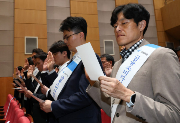 ▲29일 서울 여의도 금융감독원에서 열린 금융소비자 보호 강화를 위한 임직원 결의대회에서 직원들이 결의문을 낭독하고 있다. 신태현 기자 holjjak@