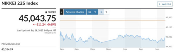 이날 마켓워치에 따르면 일본증시 닛케이225(닛케이)는 전 거래일 대비 378.07포인트(0.83%) 내린 4만4976.92엔으로 마감했다. 기술주 중심의 토픽스는 급락 출발 후 반등하지 못했다. 종가는 55.45포인트(1.74%) 내린 3131.57이었다.