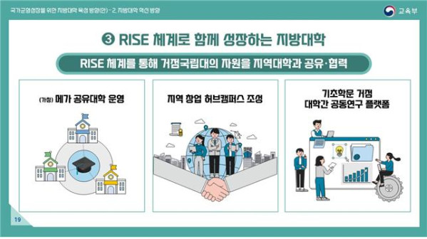 라이즈 (RISE, 지역혁신중심 대학지원) 체계도 활용해 지역 전체 대학의 동반 성장을 이끄는 생태계를 구축할 수 있도록 지원을 확대할 예정이다. 거점국립대가 지역 내 중소대학과 교육과정, 교원, 연구장비, 인프라 등을 공유할 수 있도록 한다는 계획이다. 지방시대위원회는 라이즈 체계 연계사업으로 거점대 중심의 인프라 등을 공유하는 ‘메가공유대학’도 운영할 예정이라고 밝혔다.