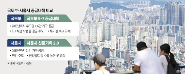 국토교통부와 서울시의 주택 공급대책과 규제 방향이 엇박자가 나고 있다는 지적이 나온다. 국토부는 공공을 중심으로 공급을 늘리되, 서울 주요 지역에 대한 규제를 강화하는 반면 서울시는 ‘신속통합기획(신통기획) 2.0’을 통해 민간 주도로 한강벨트 공급을 늘린다는 방침이다. 부동산 정책의 핵심 역할을 하는 두 기관의 전반적인 정책 방향이 엇갈리면서 시장에서는 혼선과 불안이 커질 수밖에 없다.