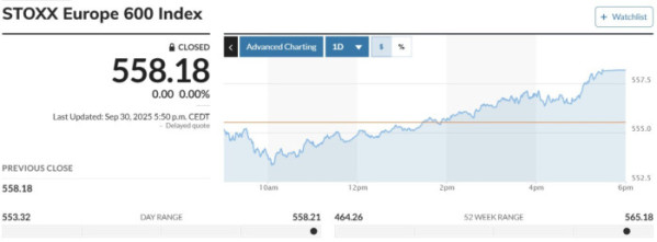 이날 유럽증시는 미국 연방정부의 셧다운이 초읽기에 들어가고 도널드 트럼프 미국 대통령의 계속되는 관세 압박 등의 악재에도 불구하고 긍정적인 분위기가 시장을 지배했다. 여러 악재에도 유럽 경제가 상당히 안정적으로 운영되고 있다는 평가가 나온 영향이다.