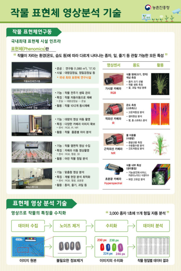 농촌진흥청은 자동화·데이터화 중심의 디지털 농업으로 전환하는 데 필요한 핵심 기술인 ‘표현체 영상분석 기술’을 개발, 다양한 분야에 기술 이전해 농업현장에 활발히 적용하고 있다고 1일 밝혔다. 이 기술은 상업용 종자 62종(밀·콩·옥수수·고추·수박 등)에 적용된 결과 분석 정확도 97%를 기록했으며, 이는 미국·유럽 선진국과 어깨를 나란히 하는 수준이다.