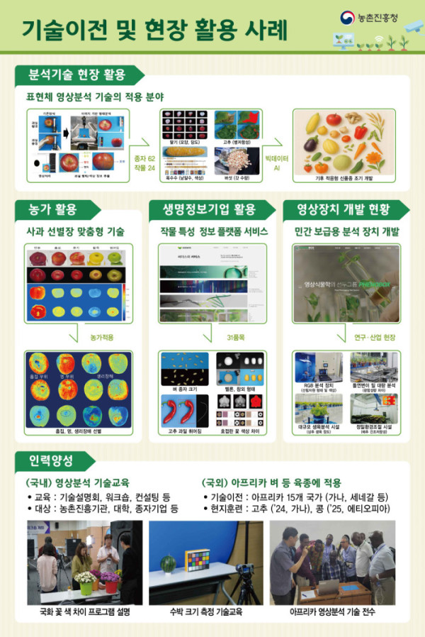 특히, 국제 협력도 활발하다. 가나·세네갈 등 아프리카 15개국에서는 현지 기후에 적합한 벼 품종을 선발하는 데 이 기술을 활용 중이다. 국내에서도 종자기업·대학·연구기관 등에 36건의 기술이전이 이뤄졌으며, 생명정보기업은 플랫폼을 통해 종자 형질 자동분석 서비스를 제공하고, 민간기업은 영상촬영 장치 개발에 나서는 등 산업 확산도 빠르다.