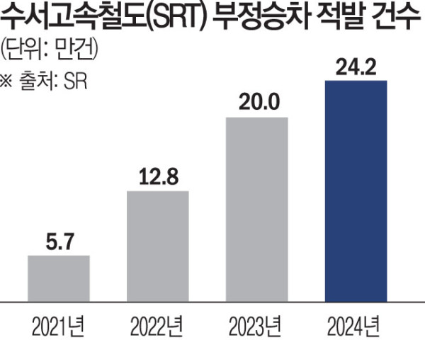 1일 국회 국토교통위원회 소속 정점식 국민의힘 의원이 ㈜에스알(SR)에서 제출받은 자료에 따르면 2021년 5만7000건에 불과했던 부정승차 적발 건수는 2022년 12만8000건, 2023년 20만 건, 2024년 24만2000건으로 해가 갈수록 늘고 있다. 4년 새 4배 이상 급증했으며, 코로나19의 여파로 승객이 감소한 2021년을 제외하더라도 3년간 2배 가까이 증가한 수준이다. 2025년 8월 말까지 이미 17만6000건이 적발돼 역대 최고치를 경신할 가능성이 크다.