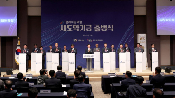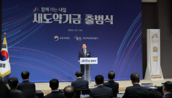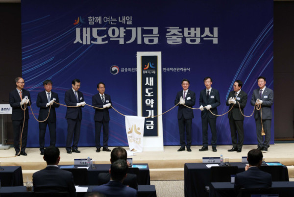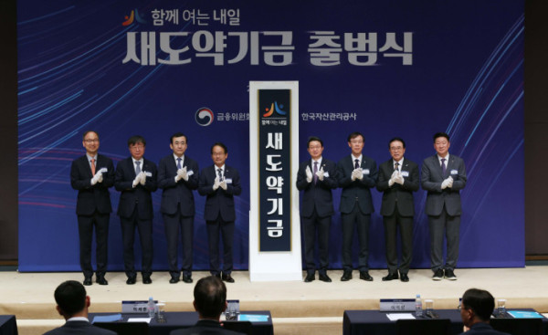 1일 서울 중구 프레스센터에서 ‘새도약기금 출범식’이 이억원 금융위원장, 양혁승 새도약기금 대표이사, 정정훈 한국자산관리공사 사장, 이재연 서민금융진흥원장, 강준현 국회 정무위 간사 등이 참석한 가운데 열렸다.