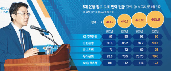 1일 국회 정무위원회 소속 국민의힘 김재섭 의원실이 5대 은행(KB국민·신한·하나·우리·NH농협)으로부터 제출받은 자료에 따르면 올해 8월 말 기준 정보보호 인력은 총 465.9명으로 집계됐다. 2022년 말 413.2명에서 2023년 말 440.7명, 2024년 말 445.95명으로 매년 증가했다.