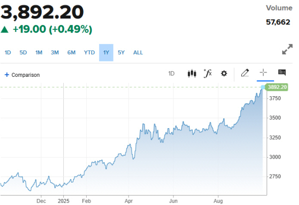 CNBC방송에 따르면 한국시간 1일 오후 3시 57분 현재 뉴욕상업거래소(NYMEX)에서 12월물 금 선물 가격은 전 거래일 대비 0.49% 상승한 온스당 3892.20달러에 거래되고 있다. 금값은 장중 한때 3904.10달러까지 오르며 처음으로 3900달러를 돌파했다.